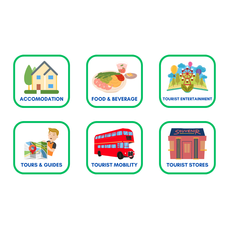 ● Food and Beverage: Restaurants, cafes, bars, and street food vendors fall into this category. They offer food and drink to tourists, often highlighting local cuisine and sustainable sourcing.