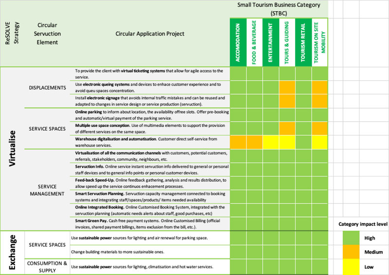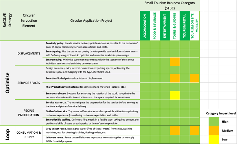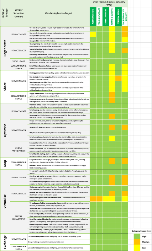 The matrix allows two types of readings: horizontal and vertical. Vertically, we can analyse which category of tourism business has the most significant potential for circular improvement, either as a whole, including all ReSOLVE strategies, or strategy by strategy. The horizontal analysis allows us to see the potential impact of a ReSOLVE strategy or its application to a service element across the different tourism business categories.