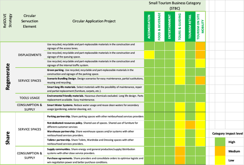 As seen in this part of the matrix, Tourist Guide Services is the tourism business category where the potential impact of the circular projects associated with the Regenerate and Share strategies is most significant. This is due to the fact that there are few or no delimited spaces for providing the service and few tools used in the service.