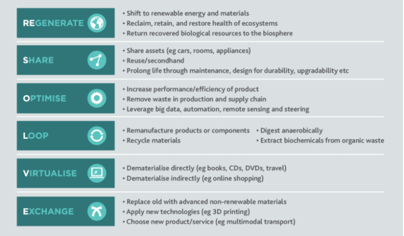 Regenerate - Shift to renewable energies; reclaim, retain and restore health of ecosystems and return recovered biological resources to the biosphere.Share - Peer-to-peer sharing of privately owned products or public sharing of pools of products. Examples include car- and home-sharing business models. Open space office sharing.