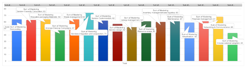 The first three themes, Exploratory Thinking, Collective Action, and Individual Initiative, are derived from the European GreenComp Framework, focusing on the relational way of thinking, collaboration for change, and personal contribution to sustainability, respectively. The fourth theme, Circular Project Implementation, features the skills compiled in the C-tour Resolve Database that takes its inspiration from the report "Circular Economy – From Review of Theories and Practices to Development of Implementation Tools" by Kalmykova et al., encompassing projects aligned with circular economy principles.Respondents were asked to rate various statements on a Likert scale from 1 to 4, evaluating both their mastery of the skills and the importance of these skills within their businesses. Each respondent's answers were indexed to reflect the average score on the questions they answered, facilitating comparisons across companies and countries. However, caution is advised when interpreting these scores, as there were some unanswered questions, and each respondent answered from a personal perspective without baseline references.